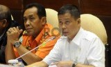 Menhub Ignatius Jonan serta Kepala Basarnas Marsekal Madya Bambang Soelistyo (kiri) saat menghadiri rapat dengar pendapat dengan komisi Komisi V DPRRI di Komplek Parlemen Senayan, Jakart, Selasa (20/1). (Republika/Agung Supriyanto) (FOTO : Republika/Agung Supriyanto)