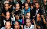 Piuluhan warga yang tergabung dalam Gerakan Rakyat Melawan Korupsi mengenakan topeng berwajah Wakil Ketua KPK, Bambang Widjojanto saat menggelar aksi di depan Gedung KPK, Jakarta, Sabtu (24/1). (Republika/Agung Supriyanto)