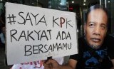 Seorang pegiat anti korupsi mengenakan topeng Wakil Ketua Komisi Pemberantasan Korupsi (KPK) Bambang Widjojanto saat puluhan aktivis menggelar aksi di Gedung KPK, Jakarta, Sabtu (24/1). (Antara/Akbar Nugroho Gumay)