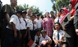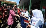 Puan Maharani (kiri), disambut oleh sejumlah siswa saat mengunjungi SMP Cisarua, Kabupaten Bandung Barat, Rabu (28/1). (foto: Septianjar Muharam) (FOTO : Republika Bandung)