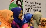 Para tamu wanita berfoto bersama saat Dies Natalis Himpunan Mahasiswa Islam (HMI) ke 68 di Jakarta, Kamis (5/2) malam. (Republika/Tahta Aidilla)