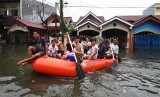 Warga dievakuasi menggunakan perahu karet ketika banjir melanda kawasan Periuk, Tangerang, Banten, Selasa (10/2). (Antara/Rivan Awal Lingga)