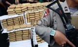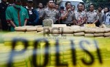 REPUBLIKA.CO.ID, JAKARTA -- Petugas kepolisian mengamankan barang bukti narkoba jenis ganja saat konferensi pers hasil penangkapan ganja Aceh di Polres Jakarta Barat, Jumat (13/2).
