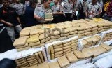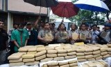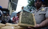 Petugas kepolisian menunjukan barang bukti narkoba jenis ganja saat konferensi pers hasil penangkapan ganja Aceh di Polres Jakarta Barat, Jumat (13/2). (Republika/Raisan Al Farisi) (FOTO : Republika/Raisan Al Farisi)
