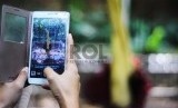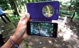 Pengunjung mengabadikan bunga bangkai raksasa (Amorphophallus titanium) yang mekar dengan telepon genggam di Taman Hutan Raya Ir. H. Djuanda, Kota Bandung, Senin (16/2). (foto : Septianjar Muharam)