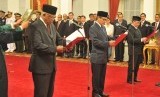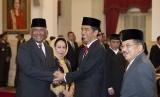 REPUBLIKA.CO.ID, JAKARTA -- Ketua sementara KPK, Taufiequrachman Ruki, Wakil Ketua sementara KPK, Johan Budi SP dan Wakil Ketua sementara KPK, Indriyanto Seno Adji, mengucapkan sumpah jabatan di hadapan Presiden Joko Widodo di Istana Negara, Jakarta, Jumat (20/2).
