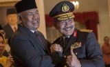 Wakapolri Komjen Pol. Badrodin Haiti (kanan) memberikan ucapan selamat kepada Ketua sementara KPK, Taufiequrachman Ruki (kiri) di Istana Negara, Jakarta, Jumat (20/2). (Antara/Widodo S. Jusuf)