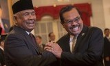 Jaksa Agung M. Prasetyo (kanan) memberikan ucapan selamat kepada Ketua sementara KPK, Taufiequrachman Ruki (kiri) di Istana Negara, Jakarta, Jumat (20/2). (Antara/Widodo S. Jusuf)