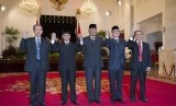 Ketua sementara KPK, Taufiequrachman Ruki (tengah) berfoto bersama dengan (dari kiri) Wakil Ketua KPK Zulkarnen, Indriyanto Seno Adji, Johan Budi SP dan Adnan Pandu Pradja di Istana Negara, Jakarta, Jumat (20/2). (Antara/Widodo S. Jusuf)