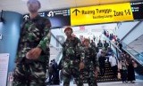 REPUBLIKA.CO.ID, TANGERANG -- Sejumlah anggota gabungan dari kepolisian dan TNI dikerahkan untuk melakukan pengamanan di Bandara Soekarno Hatta, Tangerang, Banten,Jumat (20/2).