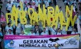 Peserta karnaval menyambut Islamic Book Fair (IBF) 2015 saat Car Free Day (CFD) di Bundaran HI, Jakarta, Ahad (22/2). (Republika/Yasin Habibi)