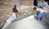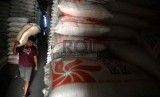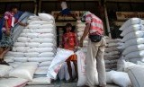 Pekerja mengangkat beras di Pasar Induk Cipinang, Jakarta Timur, Ahad (22/2). (Republika/Yasin Habibi)