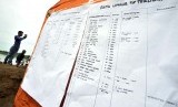 Warga memperhatikan data korban Tim SAR melakukan pencarian korban tenggelamnya perahu penyeberangan yang tenggela di Penyeberangan Mallengkeri Sungai Jenneberang, Gowa, Sulawesi selatan, Senin (23/2). (Antara/Yusaran Uccang)