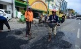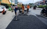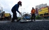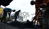 REPUBLIKA.CO.ID, JAKARTA -- Petugas dari Dinas Bina Marga memperbaiki jalan yang berlubang di Jalan Otista, Jakarta Timur, Senin (23/2).
