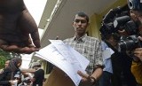REPUBLIKA.CO.ID, JAKARTA -- Staf Advokasi Hak Sipil dan Politik KontraS, Arif Nur Fikri menunjukkan berkas yang akan diserahkan pada Sentra Pelayanan Propam Mabes Polri di Jakarta, Rabu (25/2).