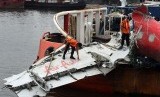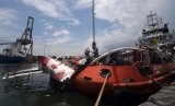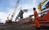 REPUBLIKA.CO.ID, JAKARTA -- Petugas memindahkan badan pesawat AirAsia QZ8501 dari kapal Crest Onyx di Pelabuhan Tanjung Priok, Jakarta Utara, Senin (2/3).