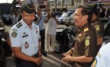 Kepala Lembaga Pemasyarakatan (Lapas) Kerobokan, Sudjonggo (kiri) menyambut Kepala Kejaksaan Tinggi Bali, Momock Bambang Sumiarso (kanan) di Lapas Kerobokan, Denpasar, Senin (2/3). (Antara/Nyoman Budhiana)