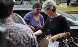 Konsul Australia di Bali Majel Hind (kanan) mendampingi Raji Sukumaran yaitu ibu dari warga Australia terpidana mati Myuran Sukumaran saat membesuk ke Lembaga Pemasyarakatan (Lapas) Kerobokan, Denpasar, Bali, Selasa (3/3). (Antara/Nyoman Budhiana)