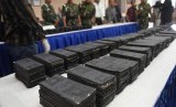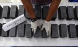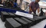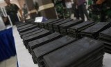 Petugas menata tumpukan ribuan lembar black dollar seusai penyerahan kasus kejahatan dari TNI AL kepada Polri di Mako Pusat Polisi Militer TNI AL di Jakarta, Jumat (13/3). (Antara/M Agung Rajasa)