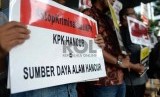 Massa yang tergabung dalam Koalisi Anti-Mafia Tambang menggelar aksi unjuk rasa di Gedung KPK, Jakarta, Jumat (13/3). (Republika/Wihdan)