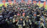 Sejumlah prajurit Batalyon Taifib-1 Marinir lengkap dengan kesenjataannya mengikuti apel memperingati HUT ke 54 Taifib Korps Marinir di Markas Yontaifib-1 Mar Bhumi Marinir Karangpilang Surabaya, Jumat (13/3). (Antara/HO/Sertu Mar Kuwadi)