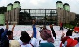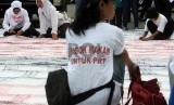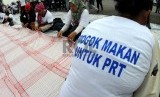 REPUBLIKA.CO.ID, JAKARTA -- Massa buruh yang mengatasnamakan Jaringan Nasional Advokasi Pekerja Rumah Tangga (Jala PRT) menggelar serbet raksasa sebagai simbol perlawanan. saat aksi di depan Gedung DPR/MPR RI, Jakarta, Selasa (24/3).
