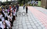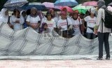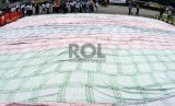Massa buruh yang mengatasnamakan Jaringan Nasional Advokasi Pekerja Rumah Tangga (Jala PRT) menggelar serbet raksasa sebagai simbol perlawanan. saat aksi di depan Gedung DPR/MPR RI, Jakarta, Selasa (24/3). (Republika/Agung Supriyanto) (FOTO : Republika/Agung Supriyanto)