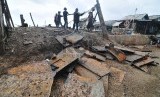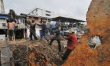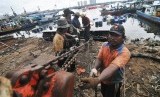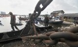 REPUBLIKA.CO.ID, JAKARTA -- Sejumlah warga menarik bangkai kapal di Muara Baru, Jakarta Utara, Rabu (25/3).