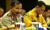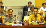 Wakapolri Komjen Pol Badrodin Haiti (kiri) didampingi Kabareskrim Komjen Pol Budi Waseso (kanan) saat Rapat Dengar Pendapat bersama Komisi III DPR, Jakarta, Kamis (2/4). (Republika/Agung Supriyanto) (FOTO : Republika/Agung Supriyanto)