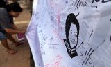 REPUBLIKA.CO.ID, SURABAYA -- Warga membubuhkan tanda tangan dukungan di sebuah spanduk ketika Barisan Relawan Tri Rismaharini menggelar aksi dukungannya di Surabaya, Jawa Timur, Ahad (5/4).
