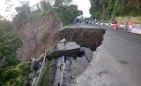 Jalur nasional penghubung Tegal - Purwokerto itu longsor sedalam 60 meter dan panjang 175 meter sehingga kendaraan roda empat dialihkan ke jalur lain.