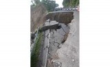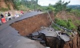 REPUBLIKA.CO.ID, BREBES -- Sejumlah warga memperhatikan jalan yang longsor di tanjakan Ciregol, Desa Kutamandala, Brebes, Jawa Tengah, Ahad (12/4).