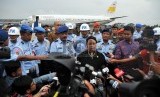 Menteri Luar Negeri Retno Lestari Priansari Marsudi memberikan keterangan pers usai Warga Negara Indonesia (WNI) yang dievakuasi dari Yaman tiba di Base Operation Landasan Udara Halim Perdanakusuma, Jakarta, Senin (13/4)(Republika/Rakhmawaty La'lang) (FOTO : Republika/Rakhmawaty La'lang)