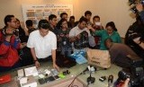 Anggota kepolisian menunjukan barang bukti dari tersangka pembunuhan "Tata Chubby" saat rilis di Polda Metro Jaya, Jakarta Selatan, Rabu (15/4). (Republika/Raisan Al Farisi). (FOTO : Republika/Raisan Al Farisi)