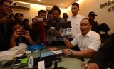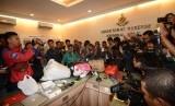 Anggota kepolisian menunjukan barang bukti dari Tersangka pembunuhan Tata Chubby saat rilis di Polda Metro Jaya, Jakarta Selatan, Rabu (15/4). (Republika/Raisan Al Farisi)