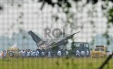 REPUBLIKA.CO.ID, JAKARTA -- Sejumlah prajurit TNI AU melakukan proses evakuasi badan pesawat tempur F16 yang terbakar di ujung landasan pacu Pangkalan Udara Halim Perdanakusuma, Jakarta Timur, Kamis (16/4).