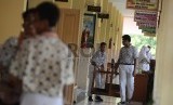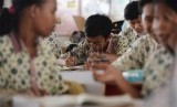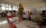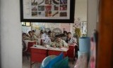 REPUBLIKA.CO.ID, JAKARTA -- Murid kelas IX SMPN 65 melakukan kegiatan belajar mengajar di ruangan sementara di Sekolah Dasar Negeri 12 Pagi, Sunter Jakarta Utara, Kamis (16/4).