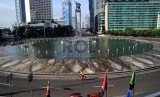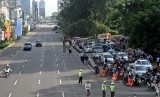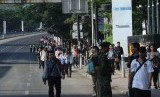 REPUBLIKA.CO.ID, JAKARTA -- Akibat penutupan sejumlah ruas jalan protokol, warga terpaksa berjalan kaki saat akan berangkat kerja di kawasan JL MH Tahmrin, Jakarta, Rabu (22/4).