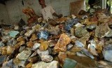 Pedagang bongkahan batu akik menunggu calon pembeli di Kampung Cibarengkok, Kecamatan Bantarkalong, Tasikmalaya, Jawa Barat, Rabu (22/4). (Antara/Adeng Bustomi)