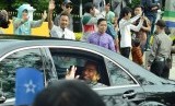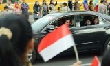 Lambaikan Tangan: Presiden RI Joko Widodo (Jokowi) melambaikan tangan kepada warga saat menuju tempat Konferensi Asia Afrika (KAA) ke-60, di Gedung Merdeka, Kota Bandung, Jumat (24/4). (Republika/Edi Yusuf) (FOTO : Edi Yusuf/Republika)