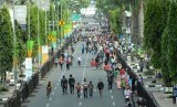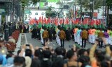Masyarakat memenuhi di Jl Asia Afrika yang dikosongkan dari kendaraan bermotor, Jumat (24/4). Masyarakat berusaha menyaksikan momen penting Konferensi Asia Afrika (KAA) ke-60 di Gedung Merdeka, Kota Bandung. (Republika/Edi Yusuf) (FOTO : Edi Yusuf/Republika)
