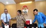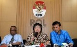 (dari kiri) Taufiqurachman Ruki,Siti Nurbaya, dan Gatot Pujo Nugroho menggelar konferensi pers usai mengadakan pertemuan antarlembaga di KPK, Jakarta, Selasa (28/4). (Republika/ Wihdan) (FOTO : Foto : Wisnu Aji Prasetyo)