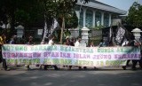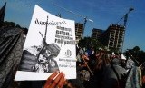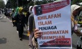 Sejumlah massa yang tergabung dalam Hizbut Tahrir Indonesia (HTI) mengacungkan poster saat rapat dan pawai akbar (RPA) 2015 dengan tajuk Bersama Umat Tegakkan Khilafah di Lapangan Gasibu, Kota Bandung, Kamis (14/5). (foto : Septianjar Muharam)