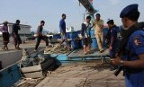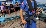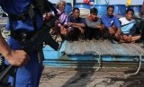 REPUBLIKA.CO.ID, BELAWAN -- Personel Dit Polair Polda Sumut berjaga di dekat nelayan asing pelaku pencurian ikan (illegal fishing) di Belawan, Sumatera Utara, Kamis (21/5).
