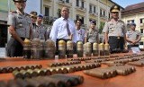 Kapolda Aceh, Irjen Pol Husein Hamidi (kedua kanan) menjelaskan senjata api jenis AK-56 beserta sejumlah amunisi yang berhasil disitai dari kelompok bersenjata, Din Minimi, saat gelar perkara di Mapolda Aceh, Banda Aceh, Senin (25/5). (Antara/Ampelsa)