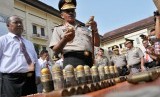 Kapolda Aceh, Irjen Pol Husein Hamidi (kedua kanan) saat gelar senjata api jenis AK-56 beserta sejumlah amunisi yang diamankan dari kelompok bersenjata, Din Minimi, di Mapolda Aceh, Banda Aceh, Senin (25/5). (Antara/Ampelsa)