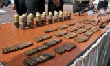 Polda Aceh menggelar barang bukti senjata api dan amunisi yang berhasil diamankan dari kelompok bersenjata, Din Minimi, di Mapolda Aceh,Banda Aceh, Senin (25/5). (Antara/Ampelsa)