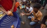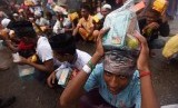 Sejumlah pengungsi etnis Rohingya asal Myanmar antre untuk mendapatkan makanan di tempat pengungsian sementara di Beyeun, Aceh Timur, Aceh, Ahad (31/5). (Antara/Zabur Karuru)