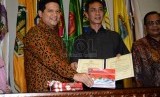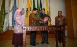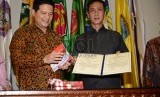 REPUBLIKA.CO.ID, JAKARTA -- Ketua KPU Husni Kamil Manik menerima Daftar Penduduk Potensial Pemilih Pemilihan (DP4) dari Sekjen Kementrian Dalam Negeri, Yuswabdi A Temanggung, saat acara penyerahan DP4 di Gedung Kementrian Dalam Negeri, Jakarta Pusat, Rabu (3/5).