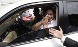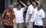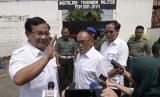 Petinggi Koalisi Merah Putih (KMP) Prabowo Subianto memberikan salam usai menjenguk Mantan Menteri Agama Suryadharma Ali di Rutan Guntur, Jakarta, Kamis (4/6). (Antara/Sigid Kurniawan)